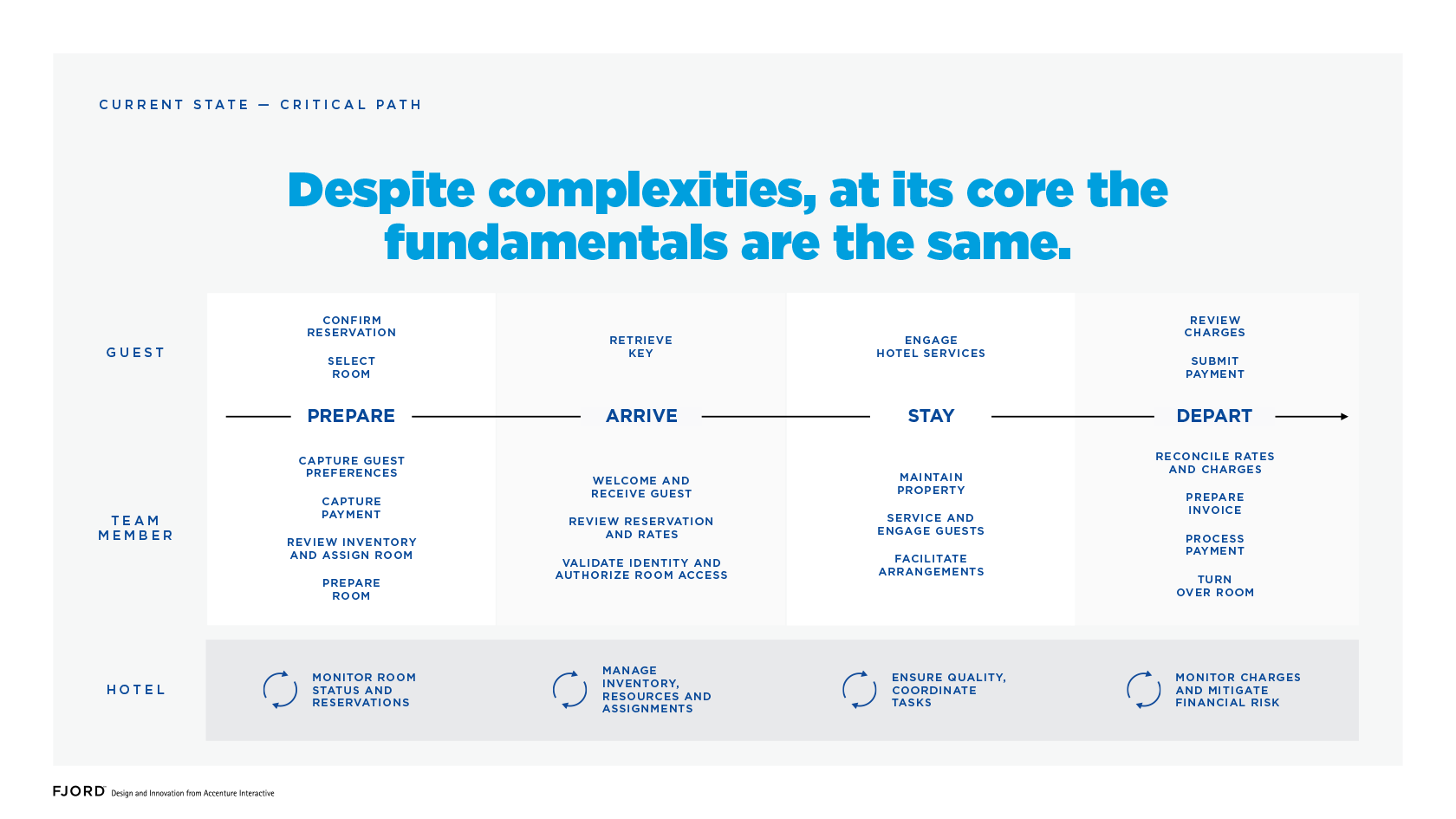 The client looked to re-platform the property system in order to reduce the costs of upkeep. Fjord was brought on to develop a product strategy, roadmap and solution architecture for the new platform based on hotel staff and guest needs.